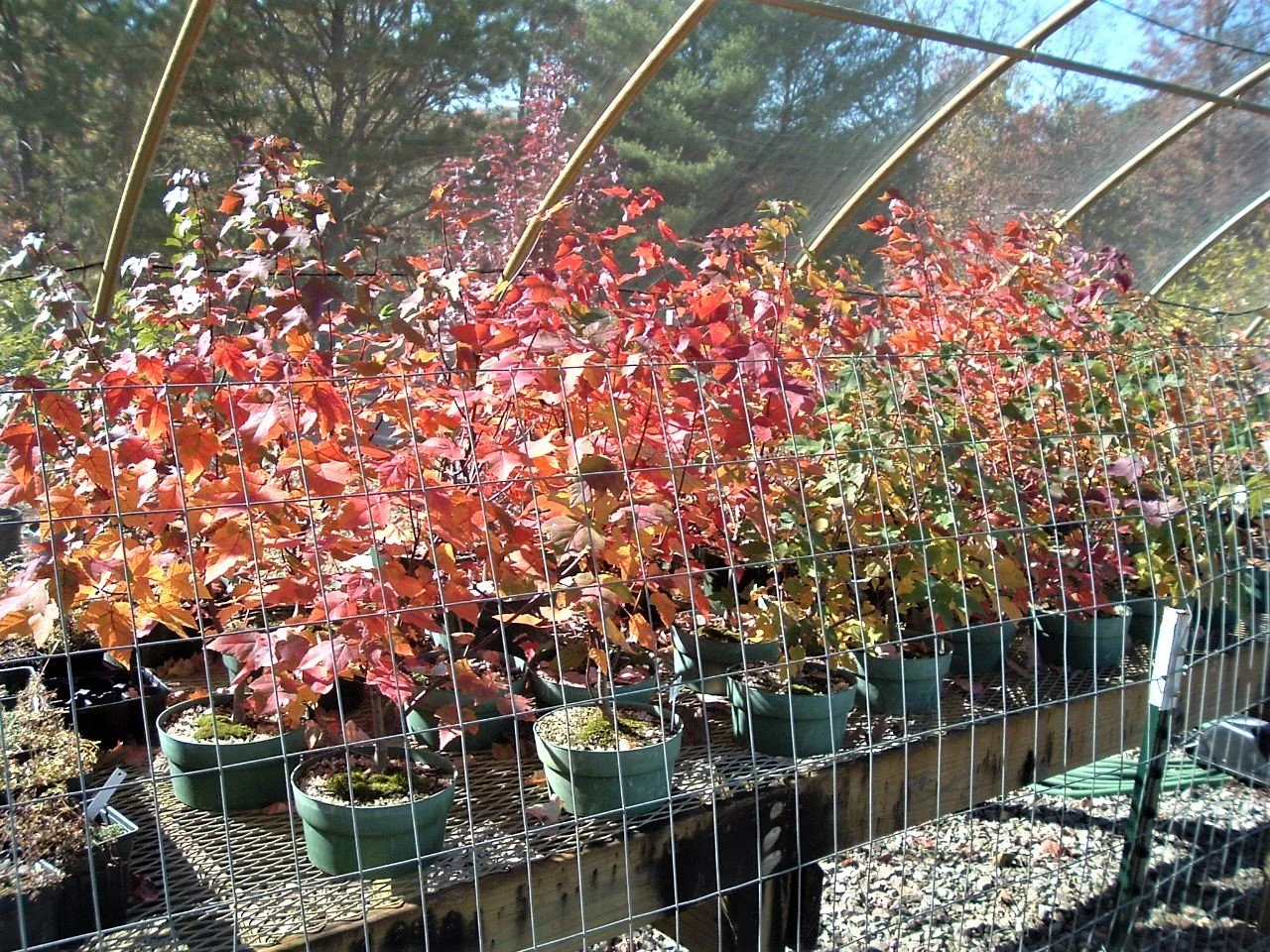 Let’s first look at the history of the tree you will be seeing in the video. Just as with the bonsai called “Long Branch,” written about last month, this red maple was one of a large number of its kind that were started from seedlings in the late 1990s. This photograph shows a bench full of these plants in autumn of 2007: