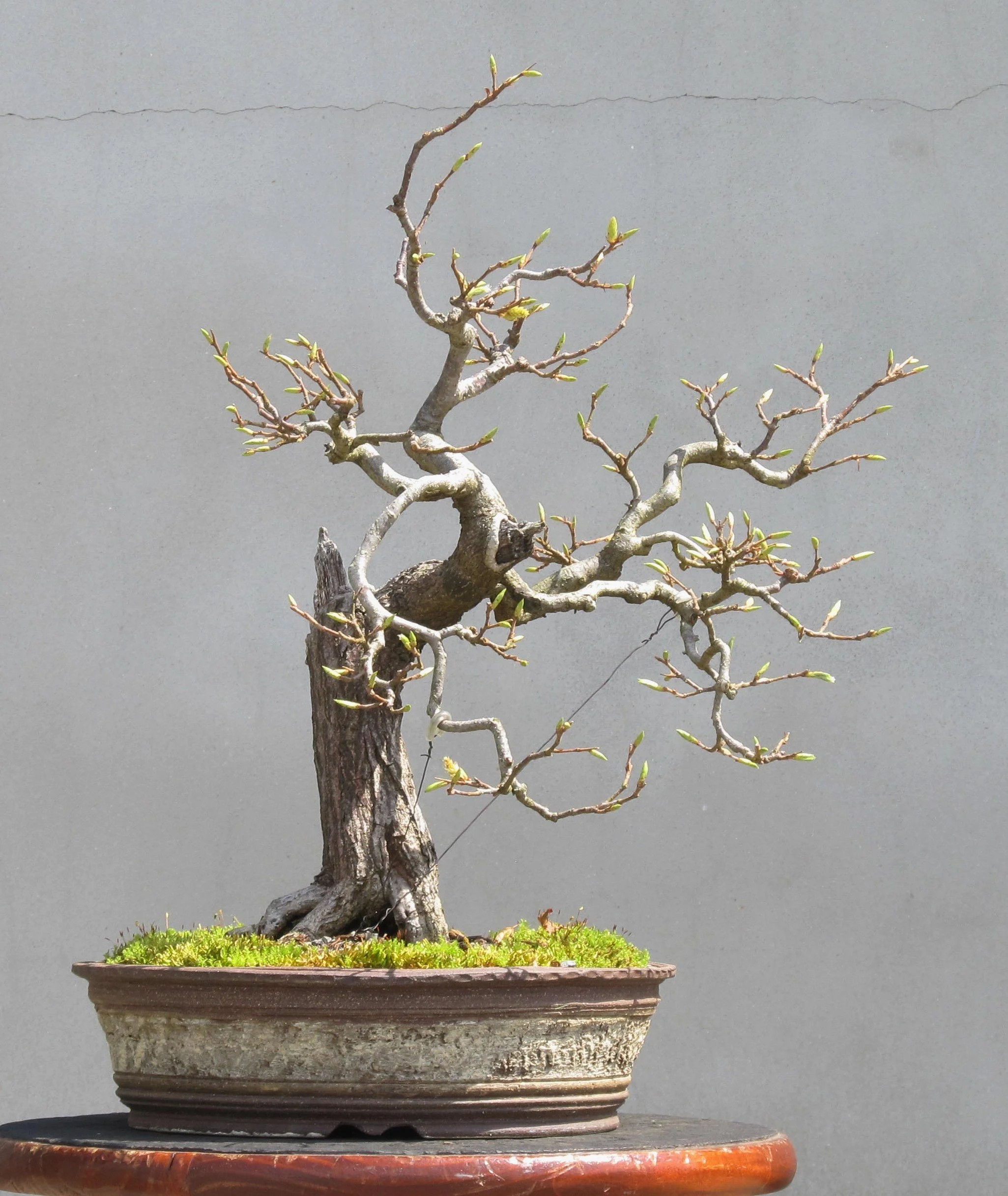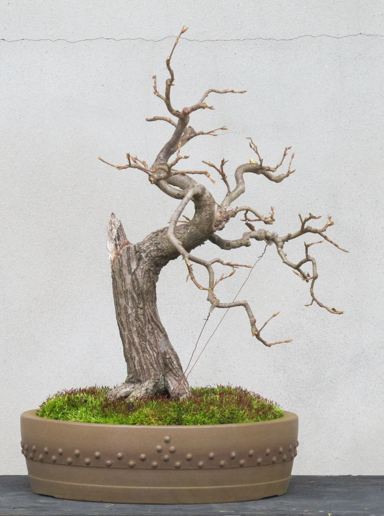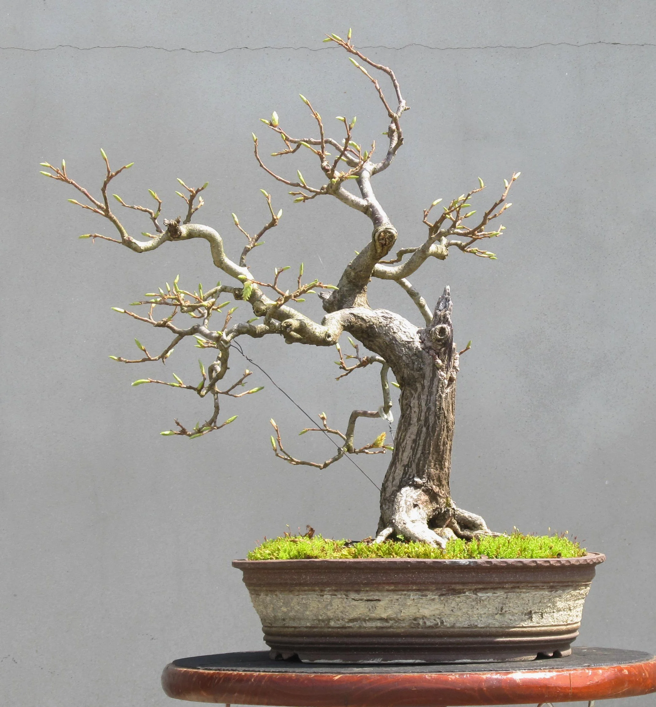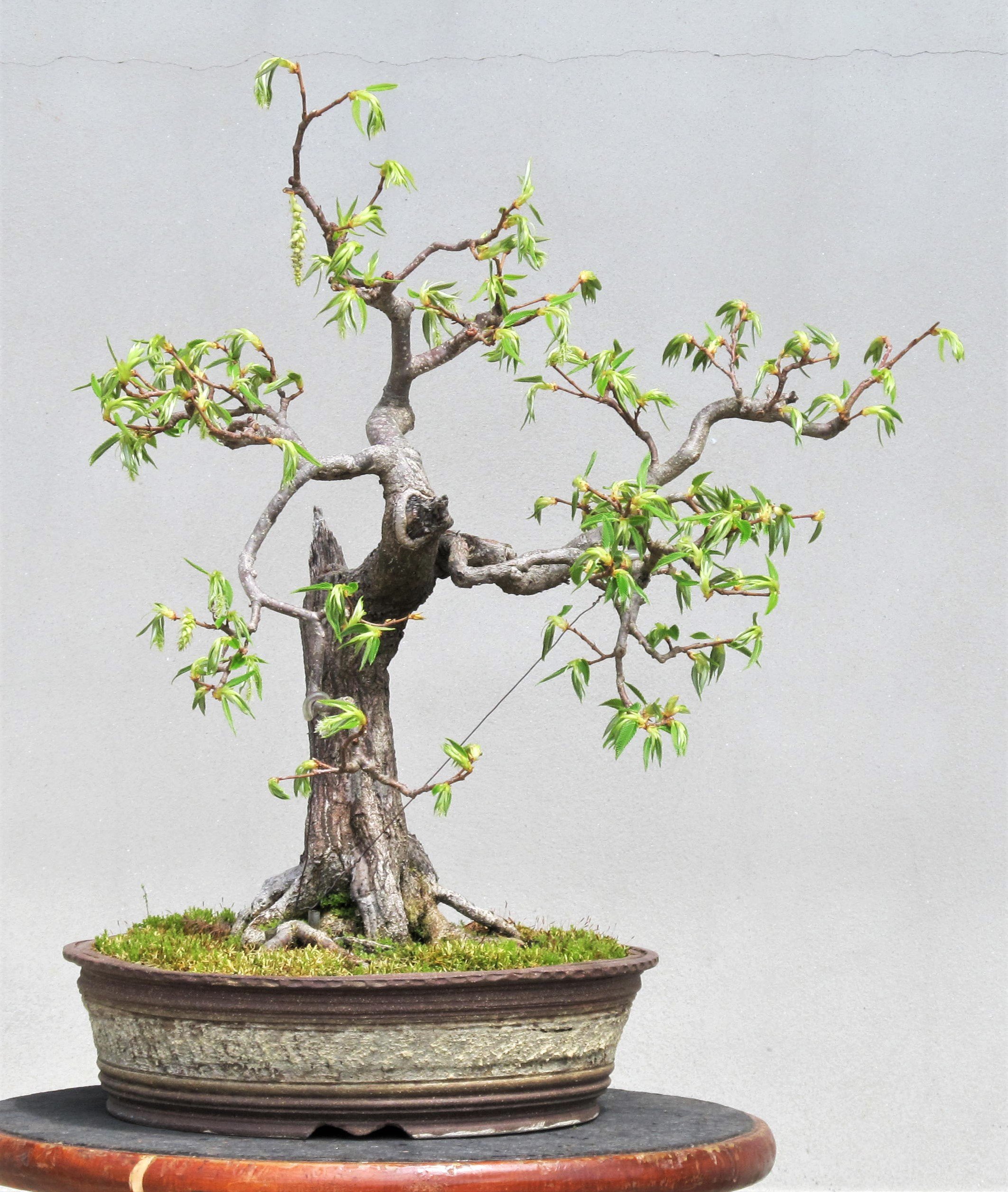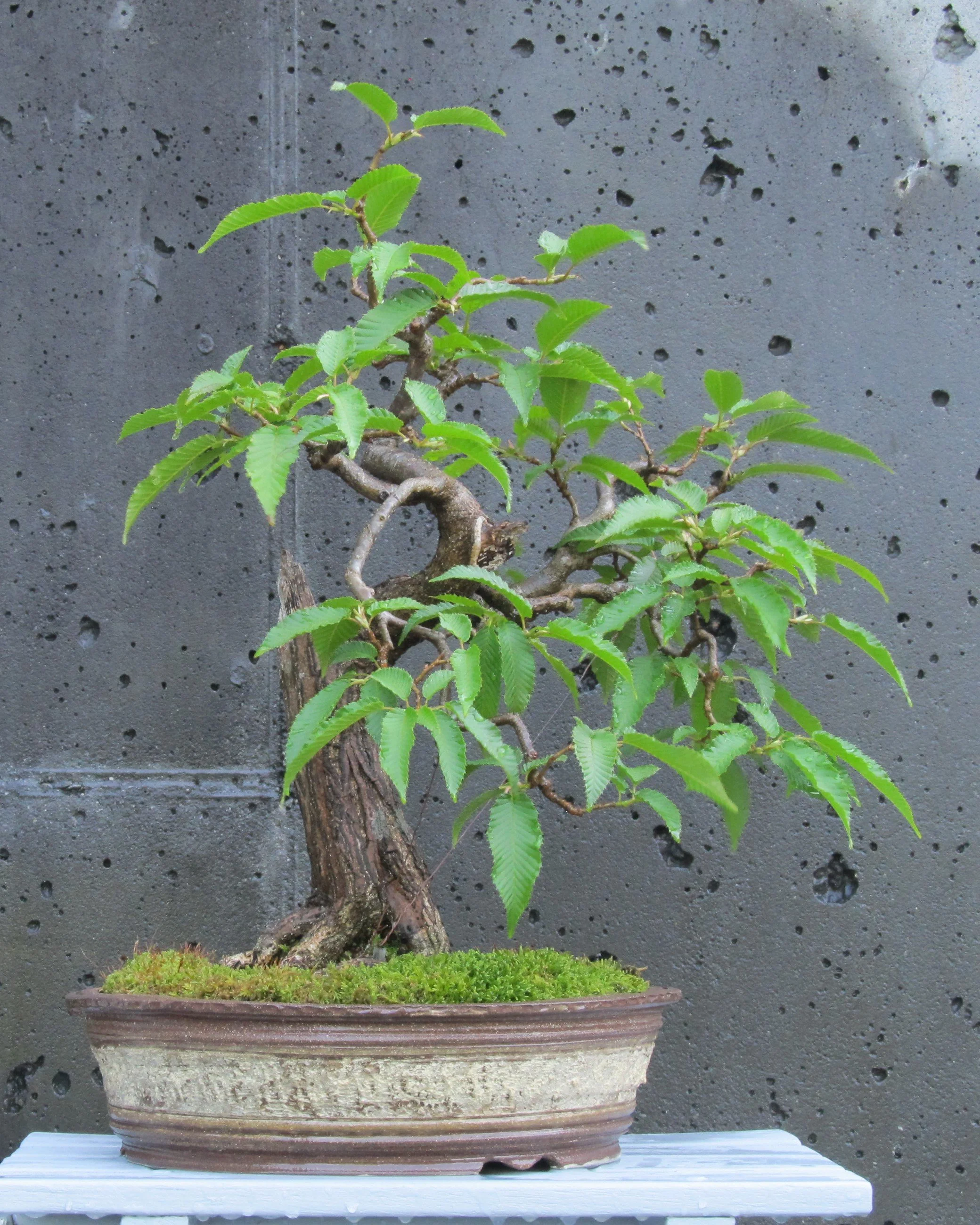 Just five months later, the Japanese hornbeam made its display debut in the bonsai garden, now potted in a container made by North Carolina potter Richard Boggs: