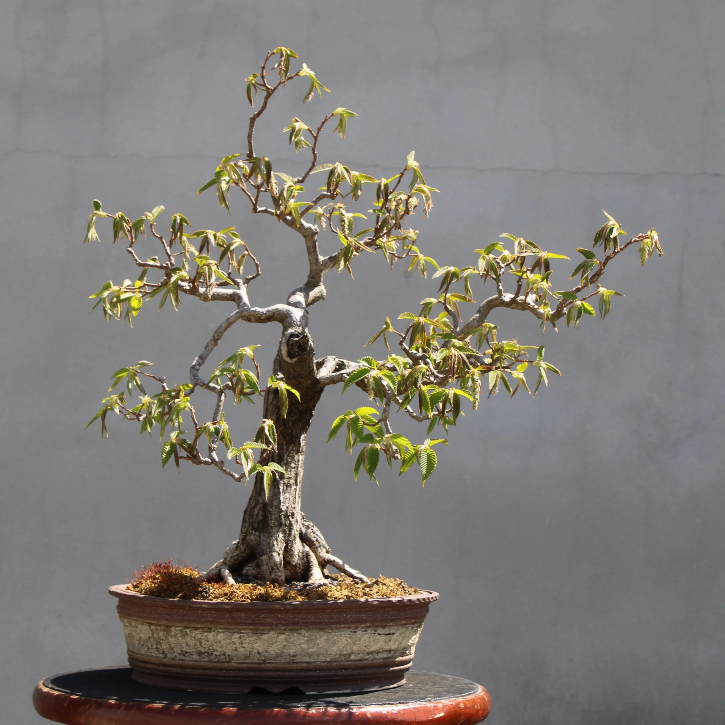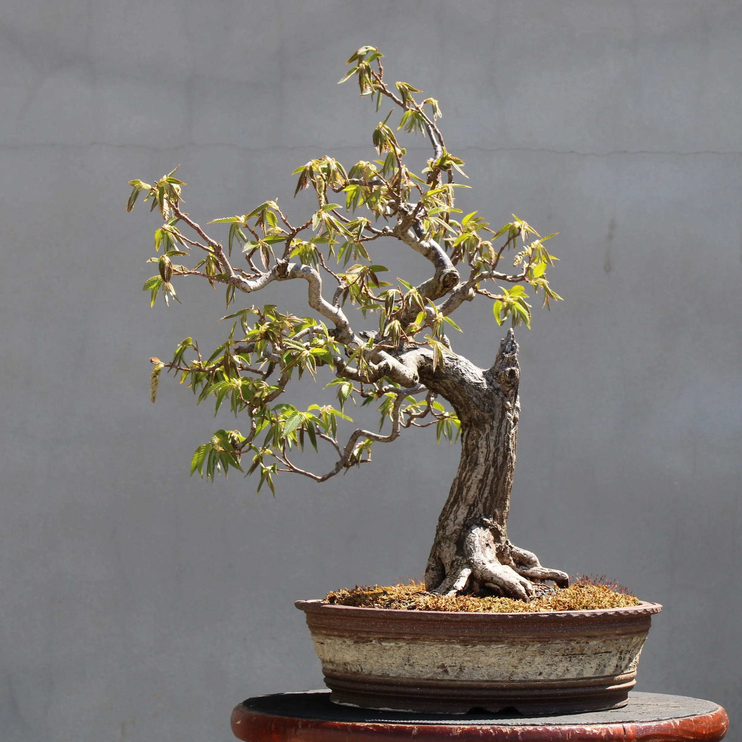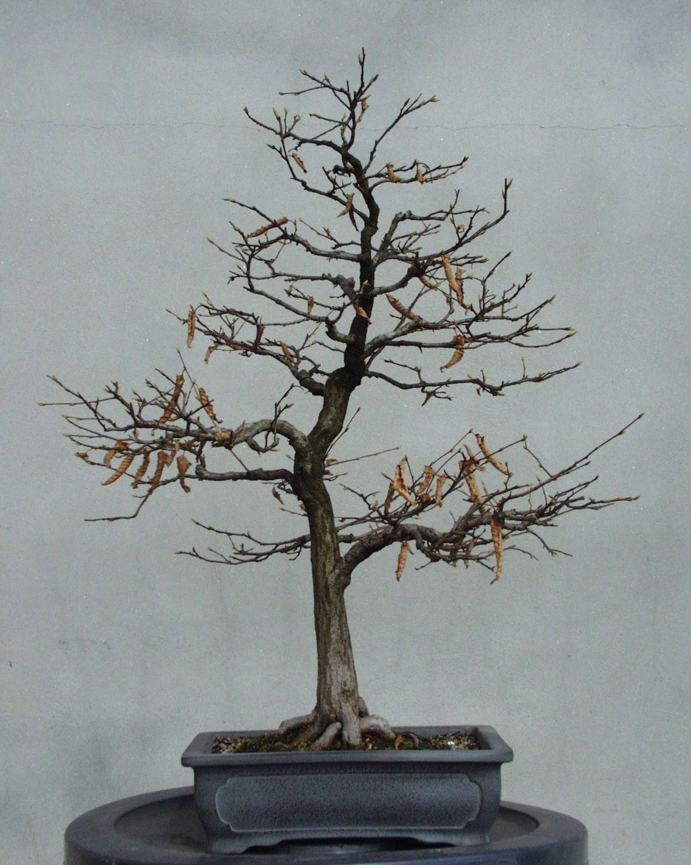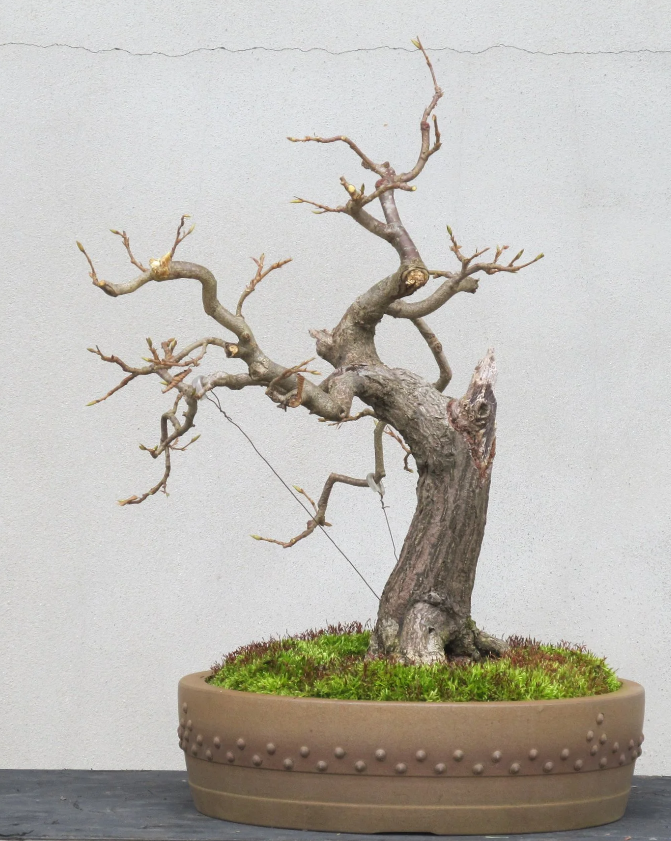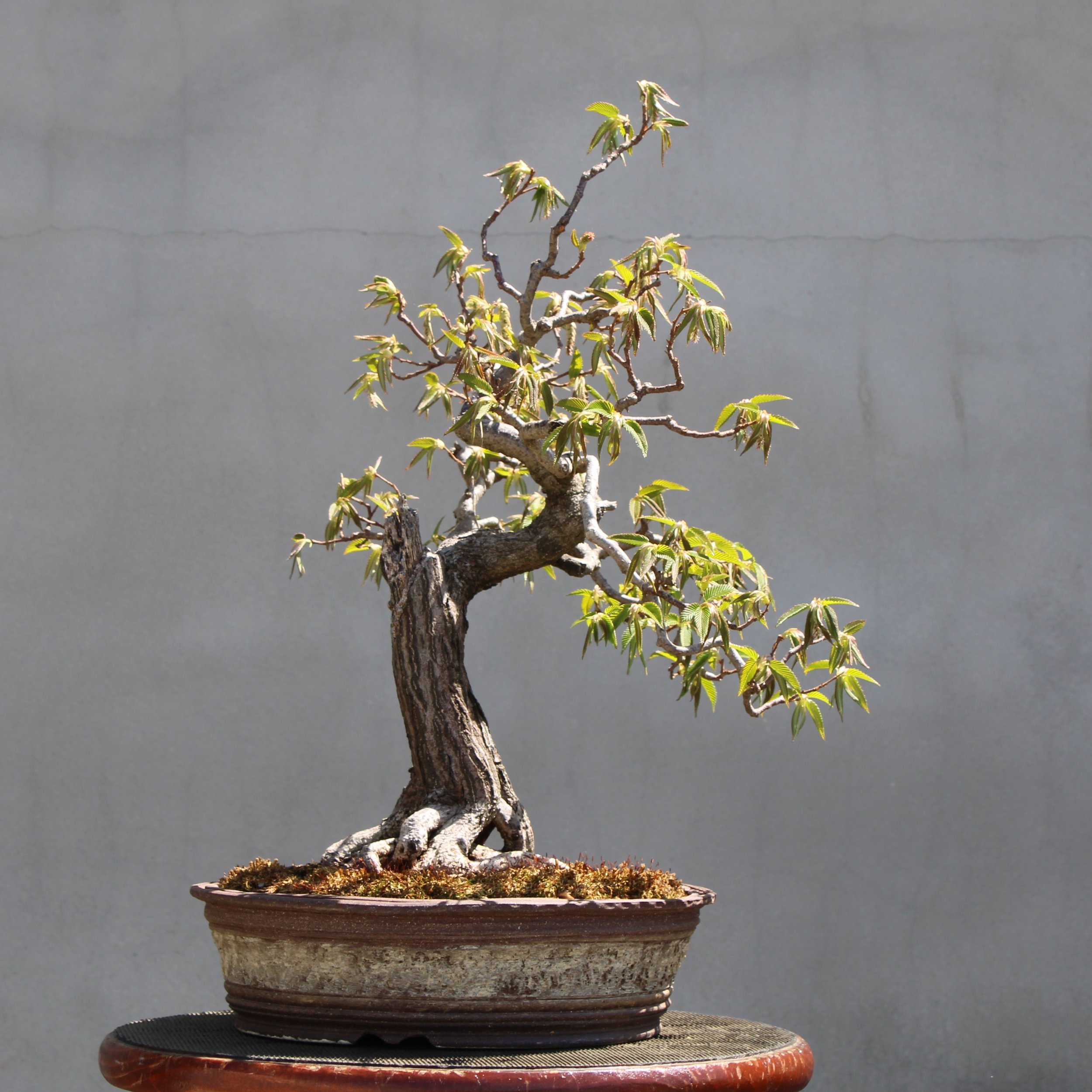 Just five months later, the Japanese hornbeam made its display debut in the bonsai garden, now potted in a container made by North Carolina potter Richard Boggs: