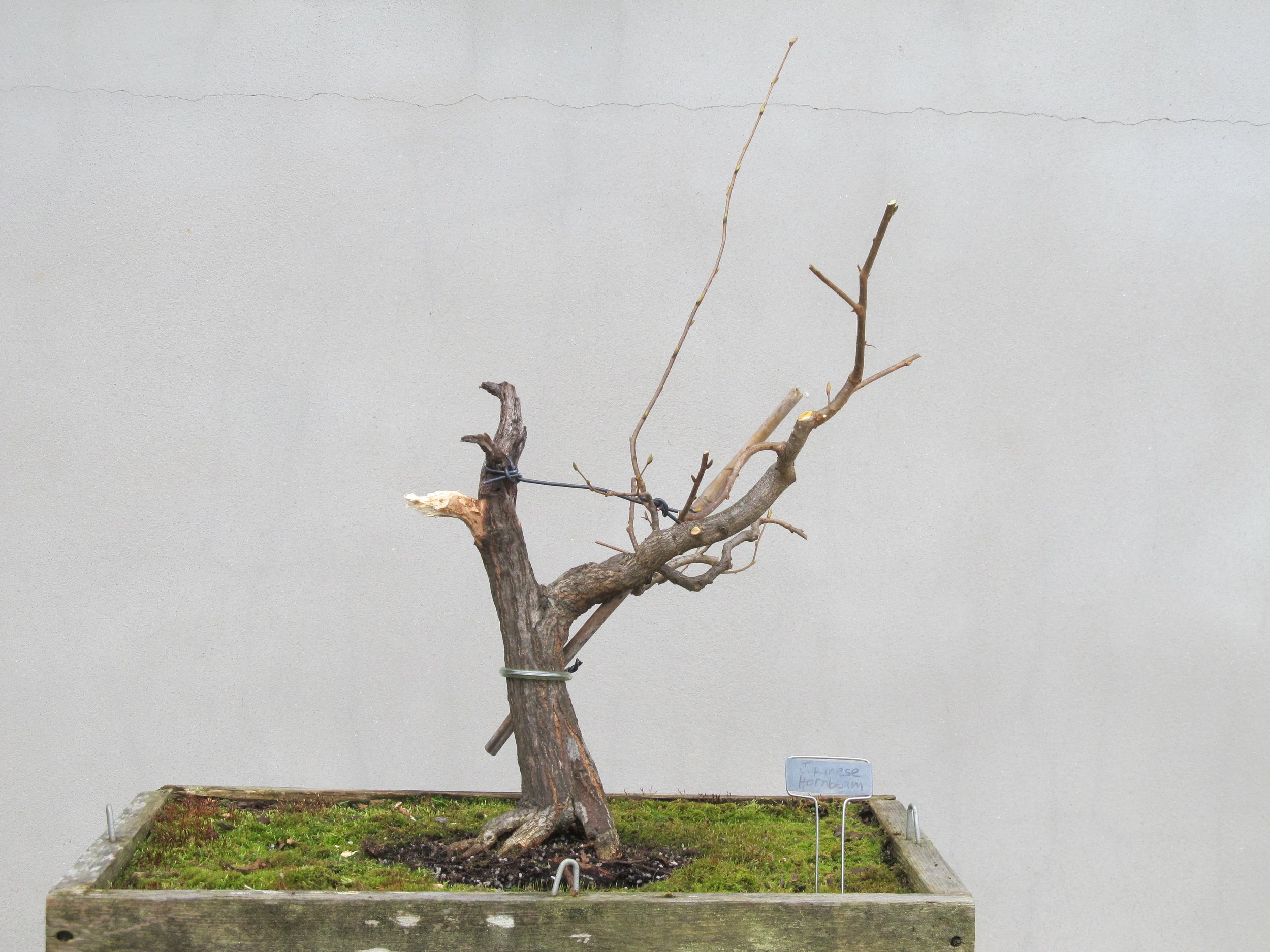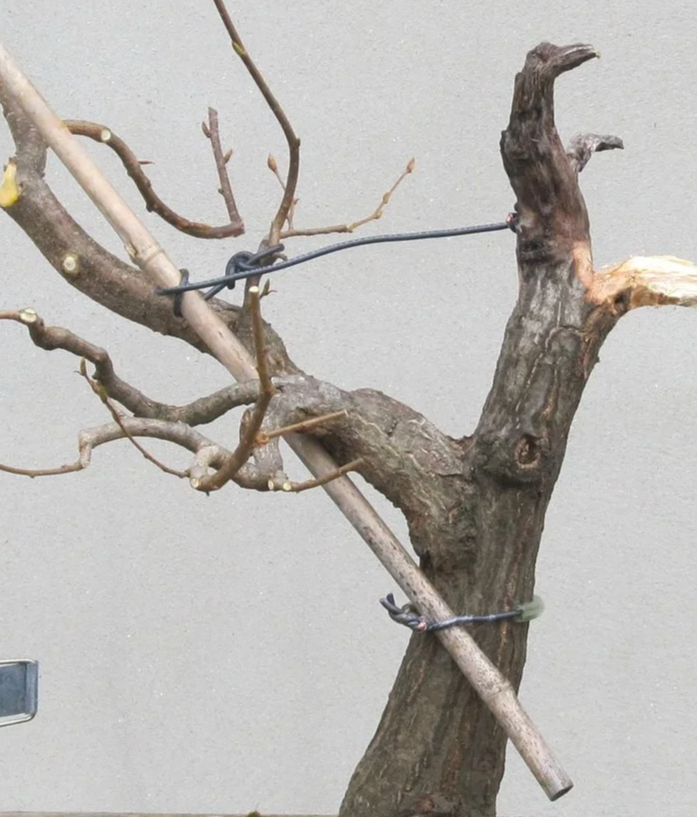 Here is what can be observed in the above images: The lowest branch on the hornbeam was chosen to be the continuation of the trunk line. The other branch was cut back to a stump and skinned of bark, thereby becoming part of the deadwood element remaining from when the trunk chop was done. A rod was attached to the trunk of the tree in such a manner as to provide stout anchorage for pulling a side branch into a strongly upward position. This turned out to be an important action and worth noting: