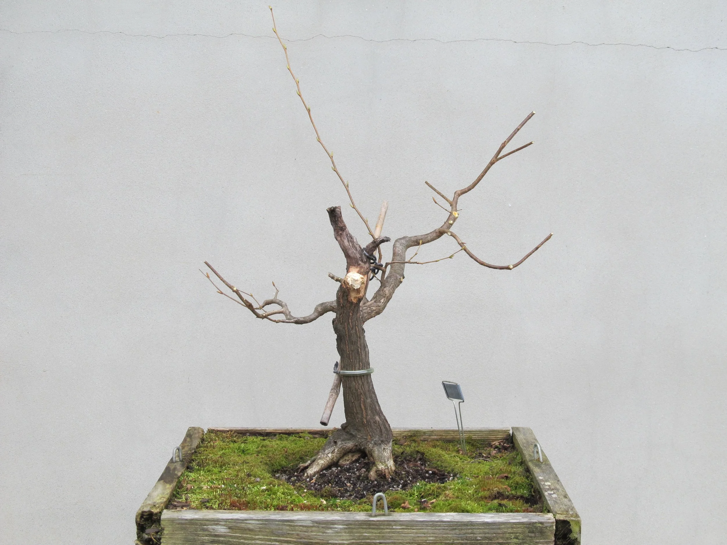 There are no photographs to document the incremental steps taken between the 2014 images and those from 2019. The process was just as I described it, though. The plant and I went back and forth until we found a shape that suited both of us. As it happened, that small branch lifted upright by use of the rod and guy wire arrangement ultimately became the the continuation of the trunk line, the new top of the tree. This outcome was not necessarily foreseen in the design session of 2014, but the work done then made it possible for that branch to eventually evolve into that role. Only after time had passed and the tree grew some more did the new possibility present itself.