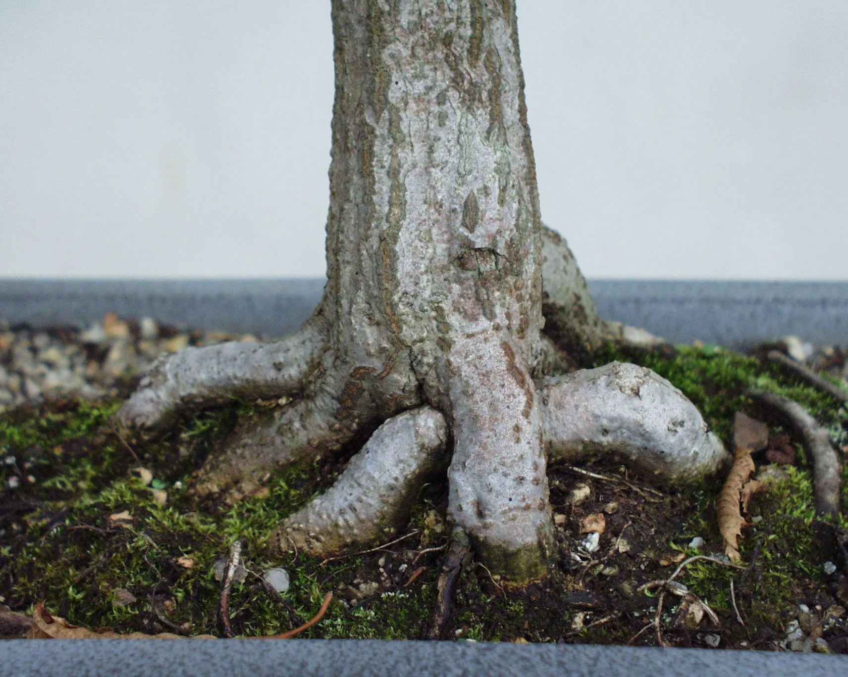 I did not think much of the tree in terms of its styling. Not that there was anything wrong with it, but it was completely conventional and did not have much personality. The single-line leader was unappealing and the trunk appeared long and spindly. Also, I didn’t like the base of the tree because it had a rogue root running perpendicular to the other surface roots, even crossing under one of them: