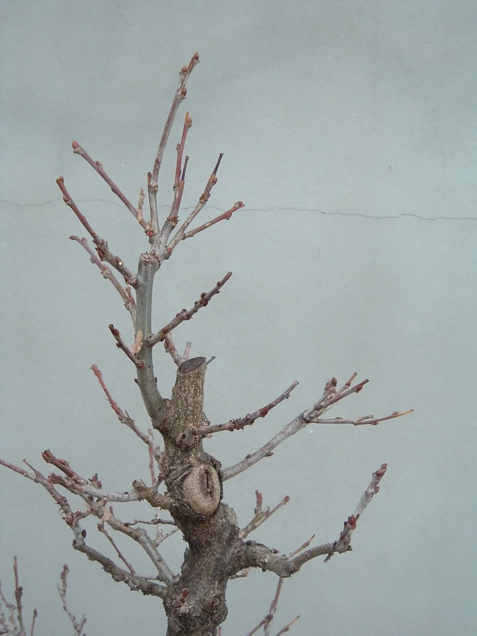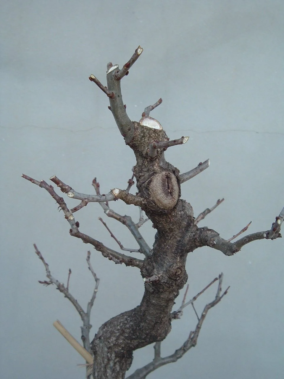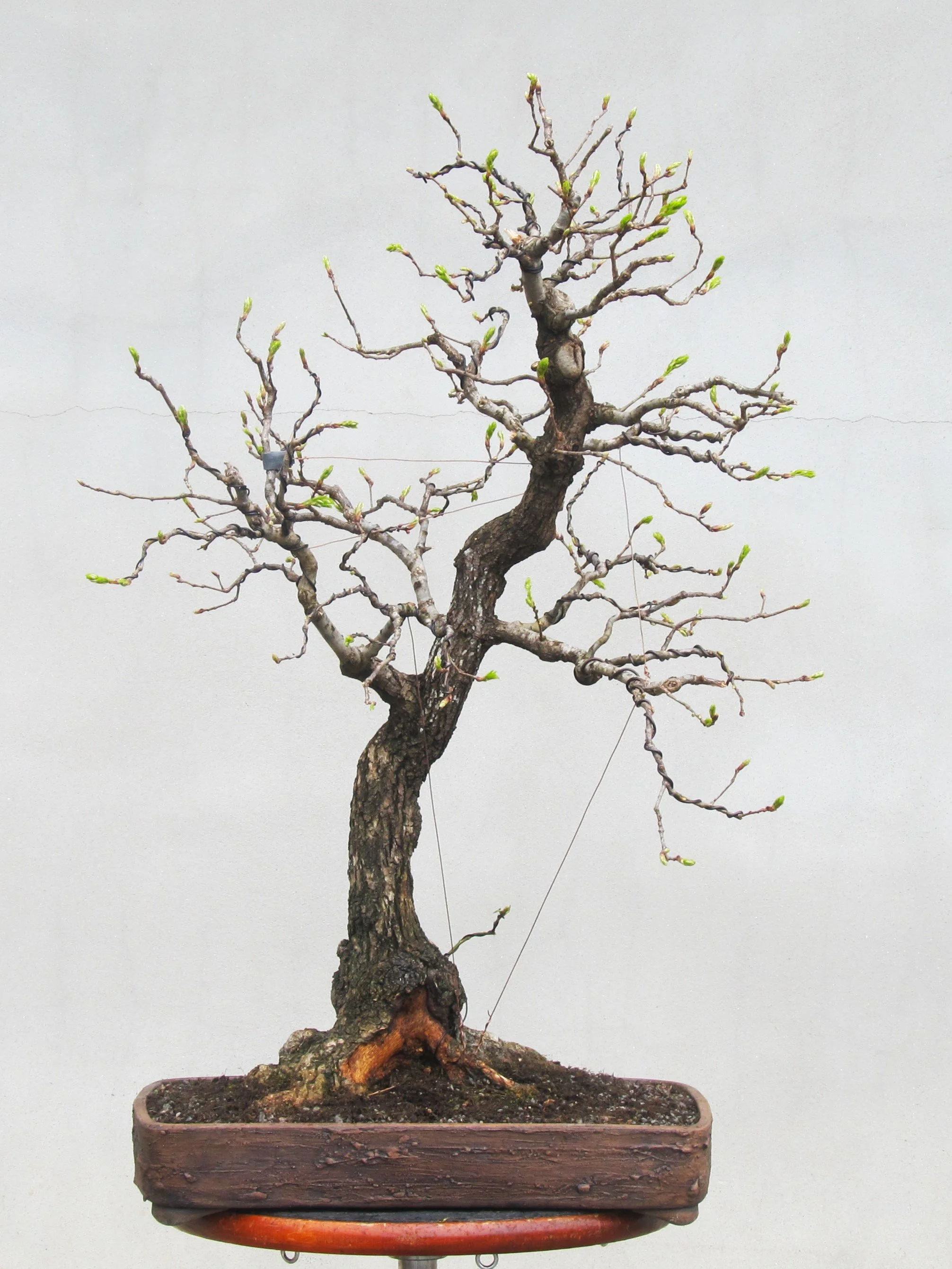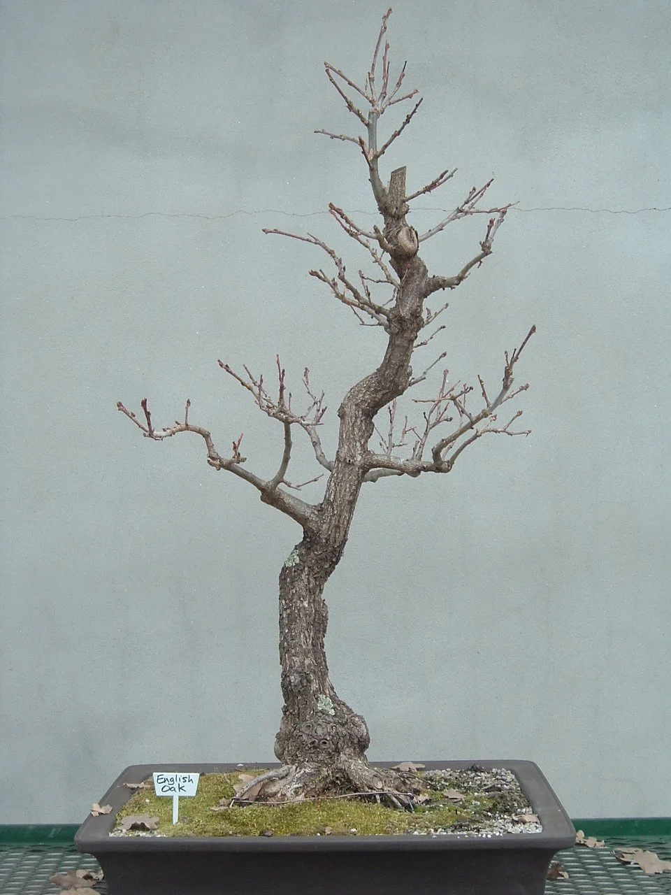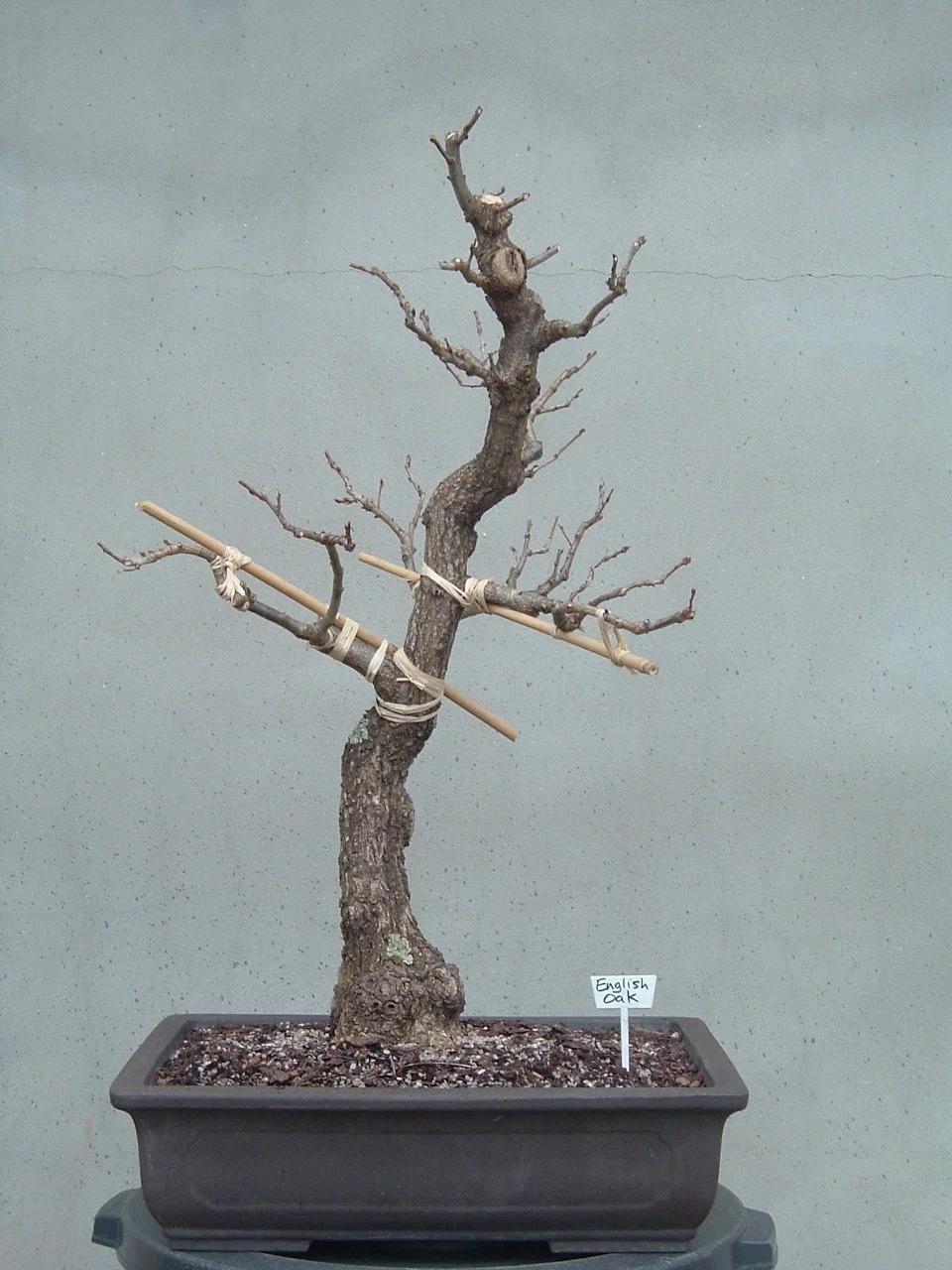 I began to worry about it, though. All the other damaged plants one by one recovered and clothed themselves again in green, while the English oak sat there naked and forlorn. April passed, and May, and nothing happened. There was still green showing under the bark, however, so I continued to wait. June came and went. July came and went. August arrived, and still this one little tree was bare and seemingly without life, appearing even more so for all the other leafy plants prospering all around it. Still, it showed green when I scratched on its limbs. If this situation had gone on much longer, I may have killed the tree by stripping off all its bark while continuously checking to see if it was still alive. Toward the end of August tiny buds finally appeared. The tree eventually produced little leaves, maybe half their normal size, and just one sparse crop of them. The growing season for this oak that year was about six weeks, and then the leaves fell off. Next spring it came out normally. The tree lost some limbs, but after allowing it a year of vigorous growth I was able to begin working with it once more in 2009.