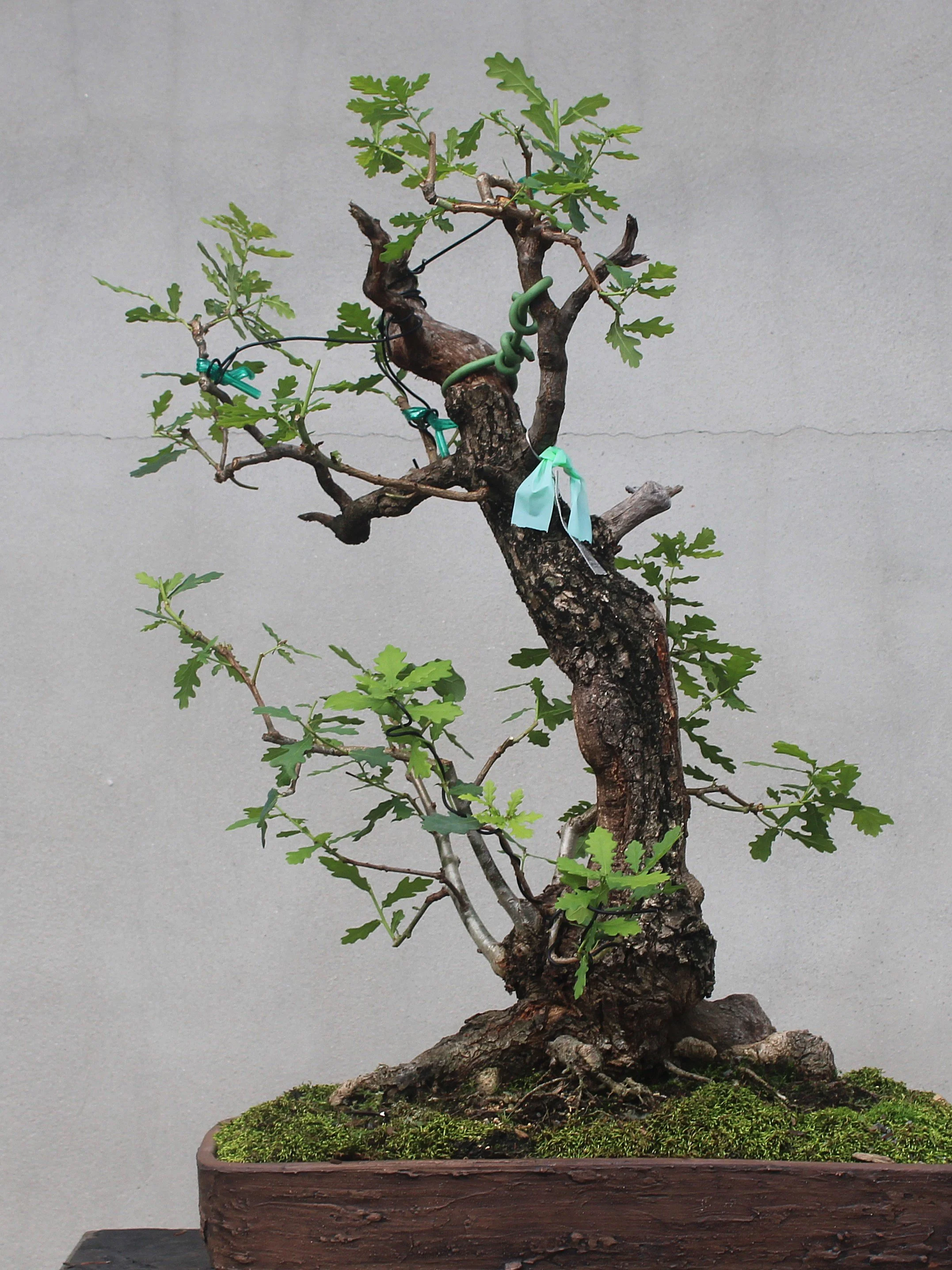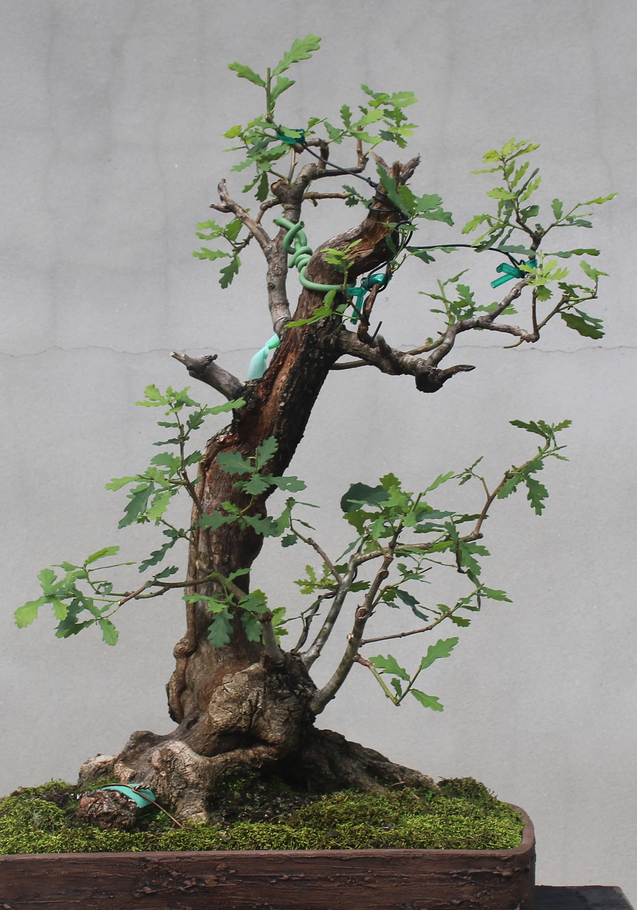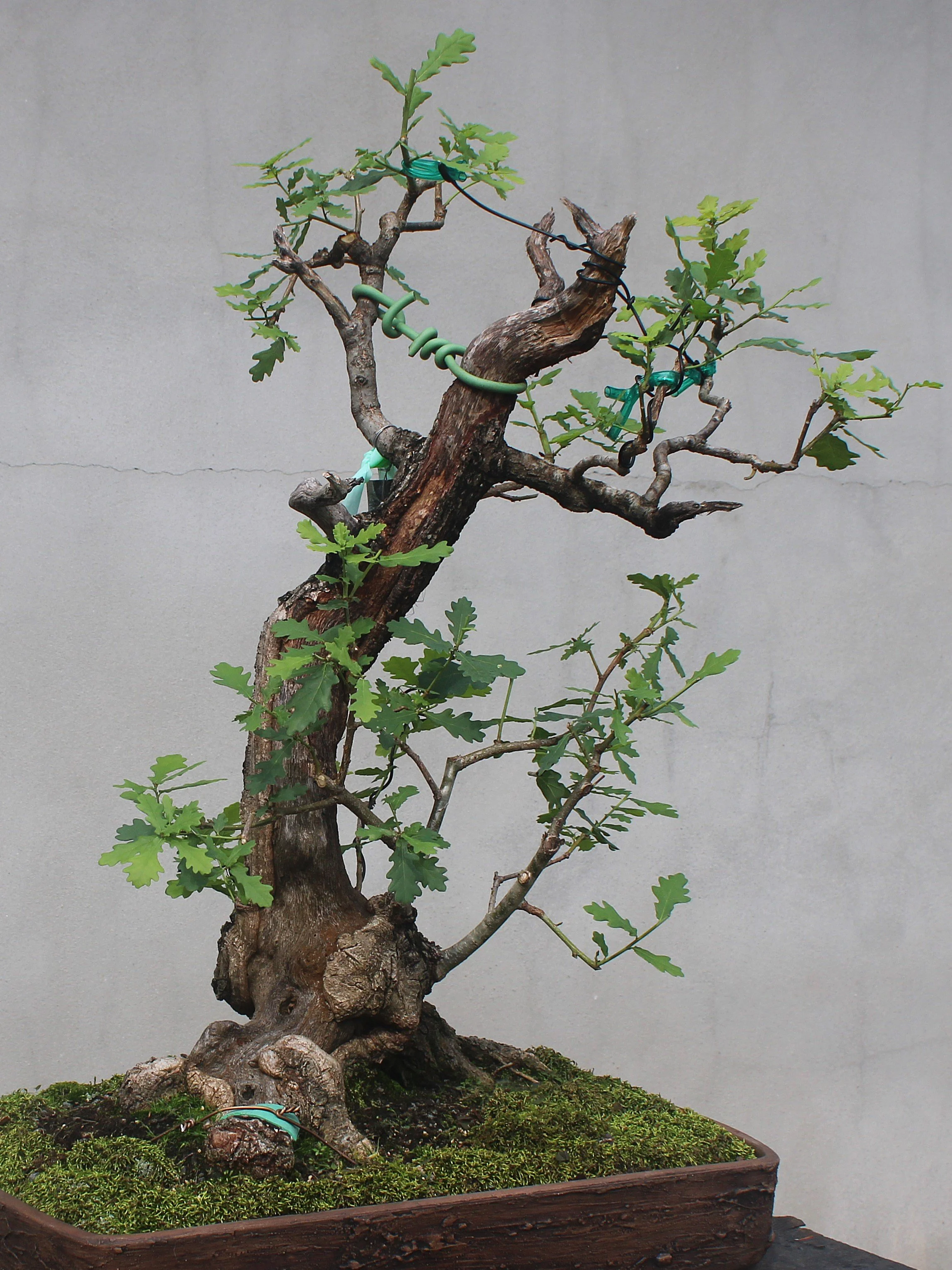 I didn’t do that. Instead I let it go on growing in its big pot and the oak responded by pushing out vigorous growth from all the parts it had that weren’t dead. I’d trim those rank shoots now and then and I’d look at the tree and try to see something in it. Finally, just last year, I thought I saw something.