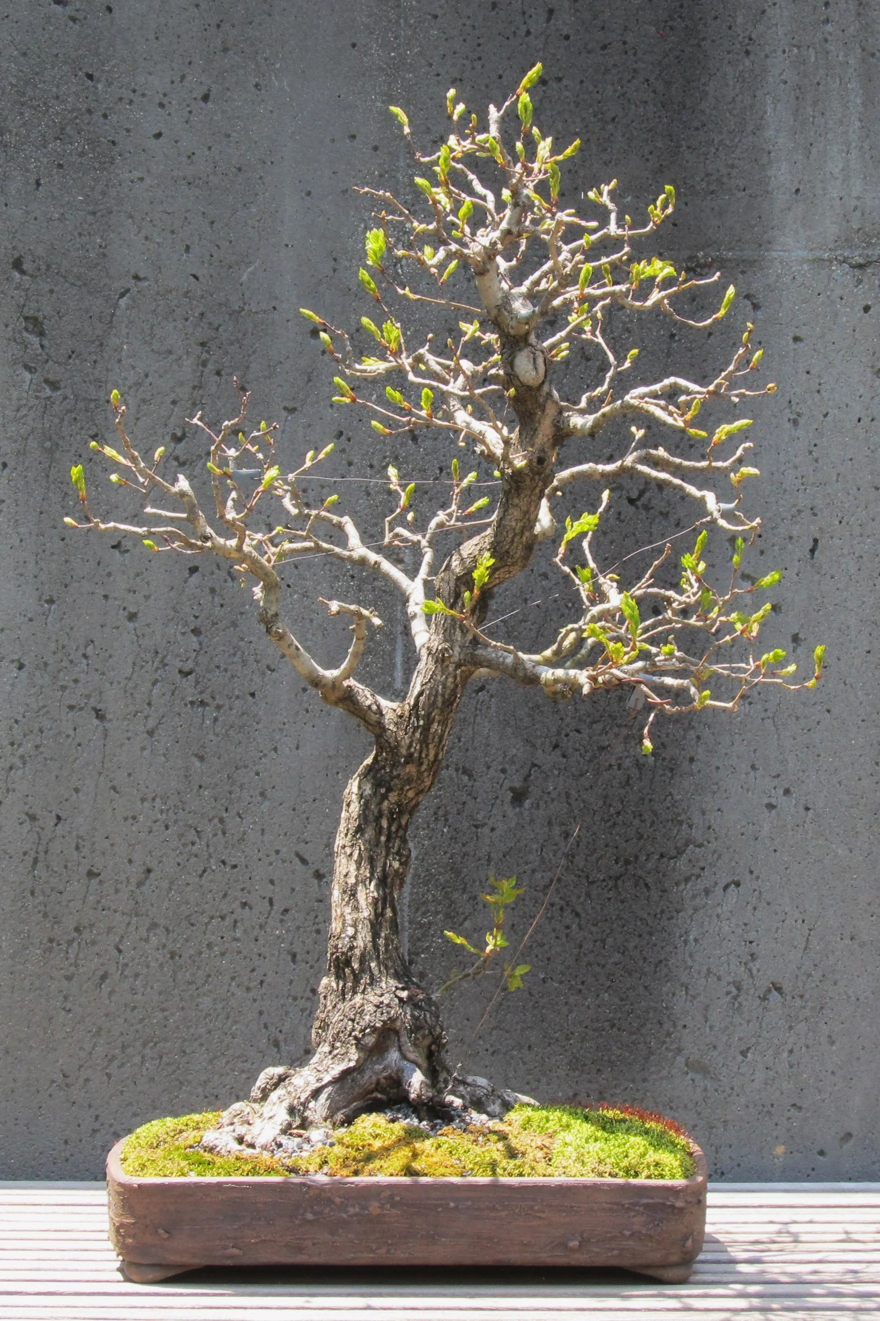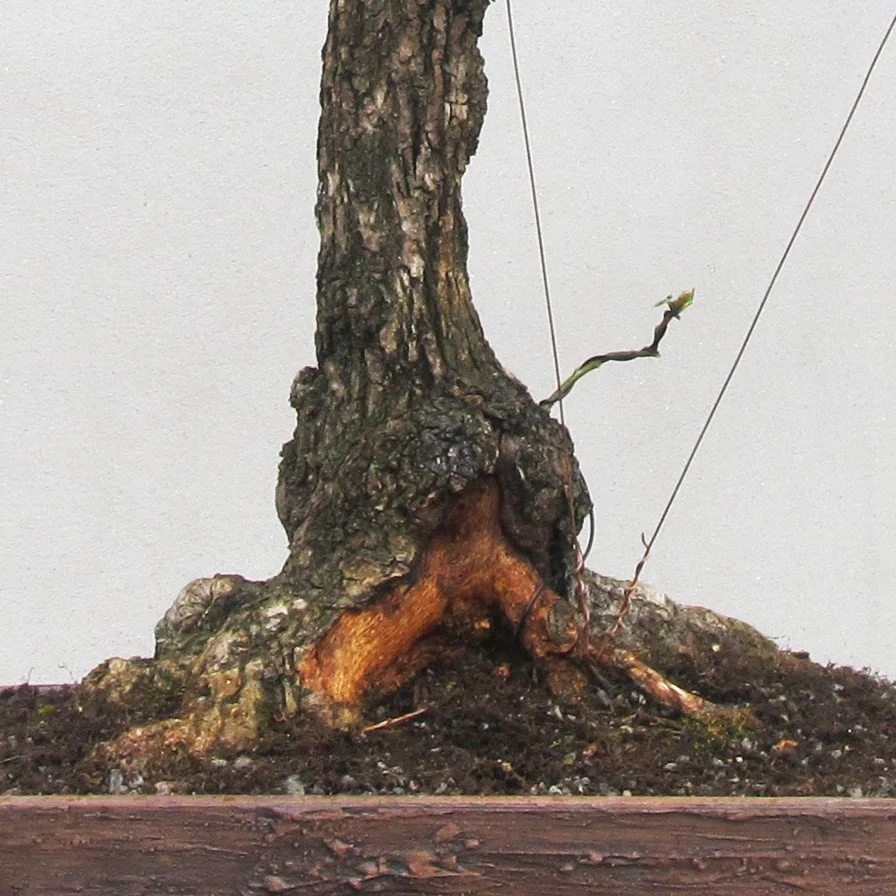 This development was pretty discouraging. The oak had come a long way from its humble acorn beginnings and was finally starting to look like something. Die-back on trees is always associated with some event, often a wound, as might occur from an accident or a pruning cut. In this case I suspect the cause might have been fungal, although I never saw any evidence of it. Regardless, our English oak now had a big, fat dead area right front and center on its base when seen from the primary viewing angle. I considered trying to carve it out and make it into a cavity, but never followed through on that idea. Instead, I let the tree be and didn’t put it out on display that year.
