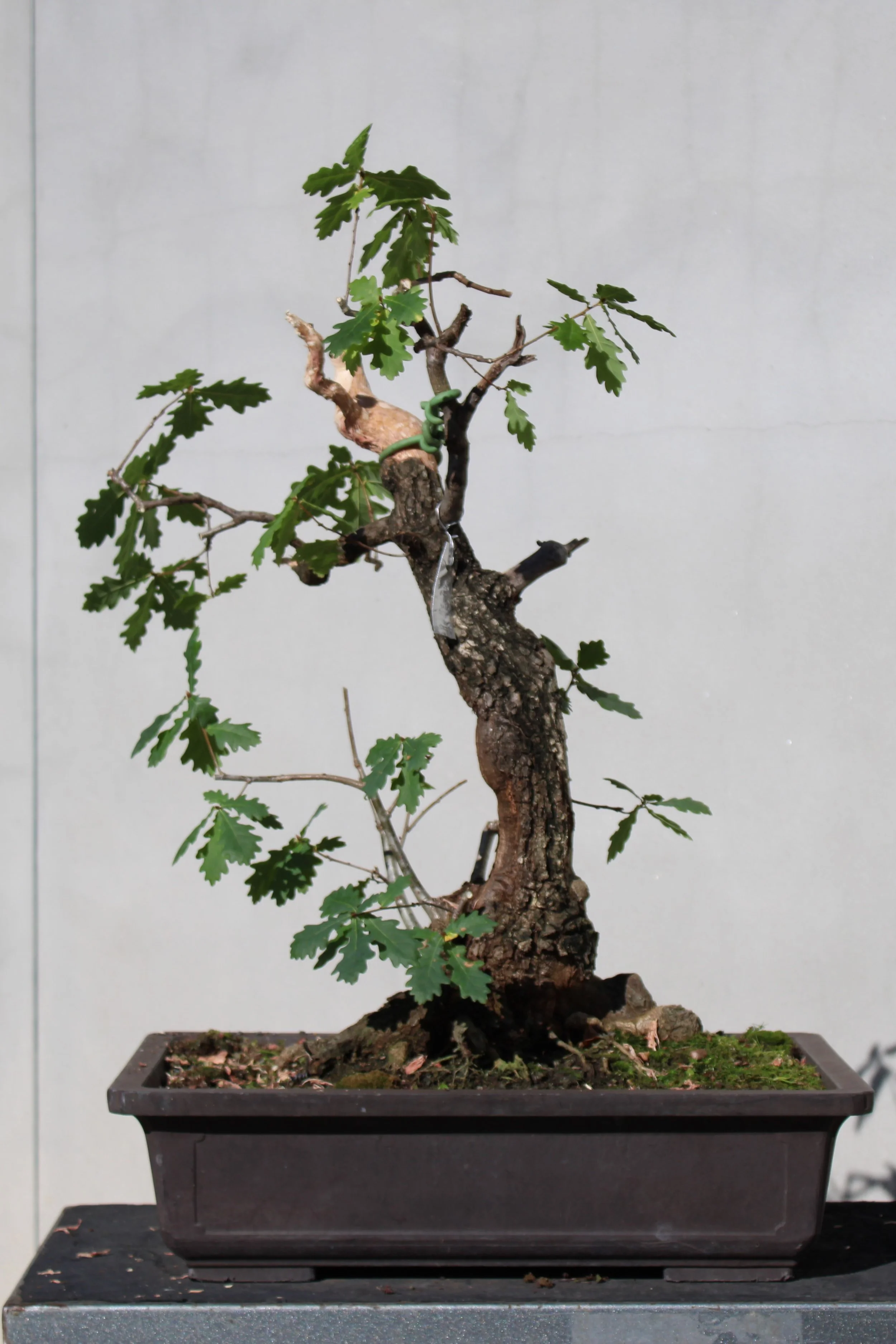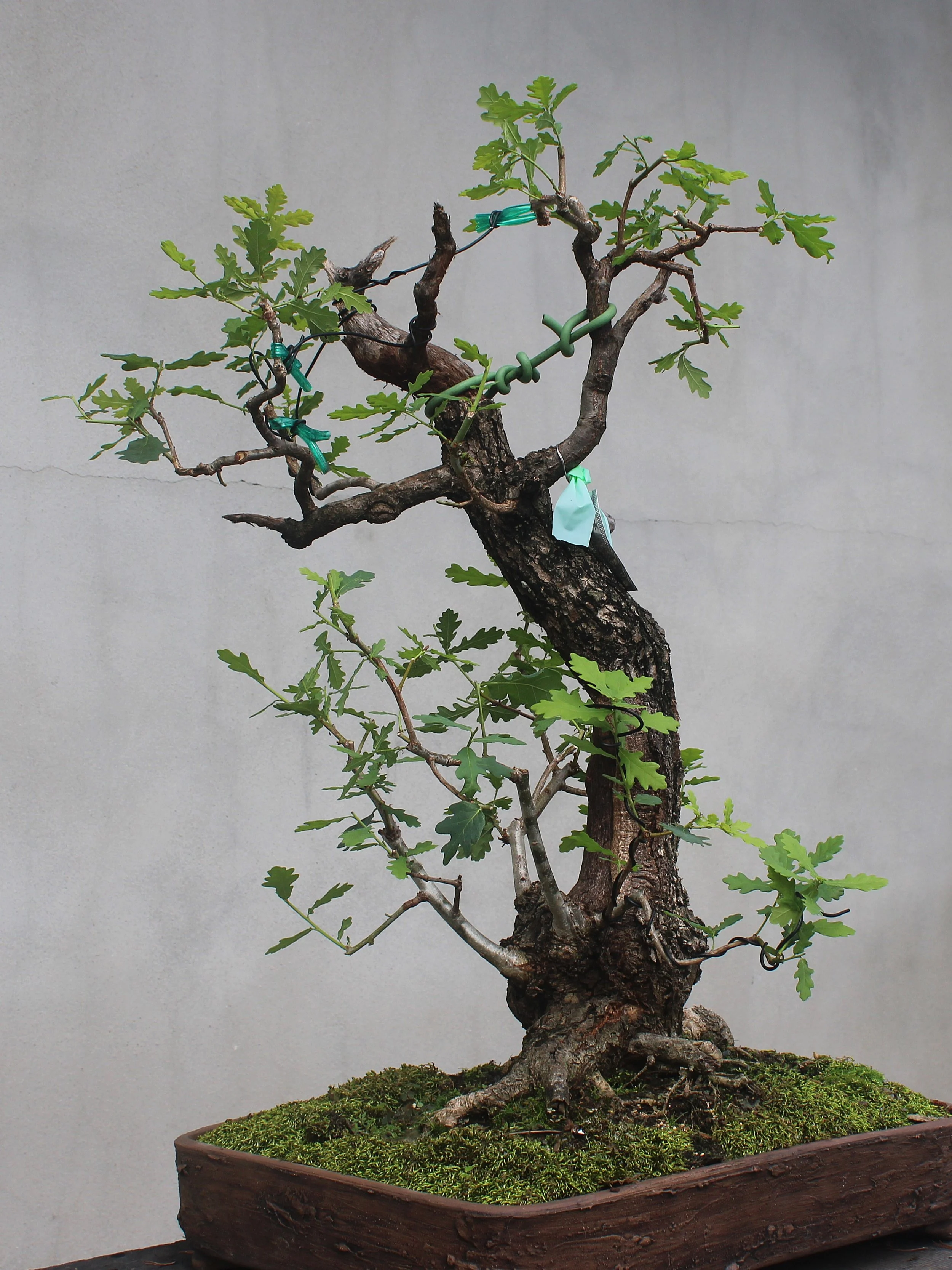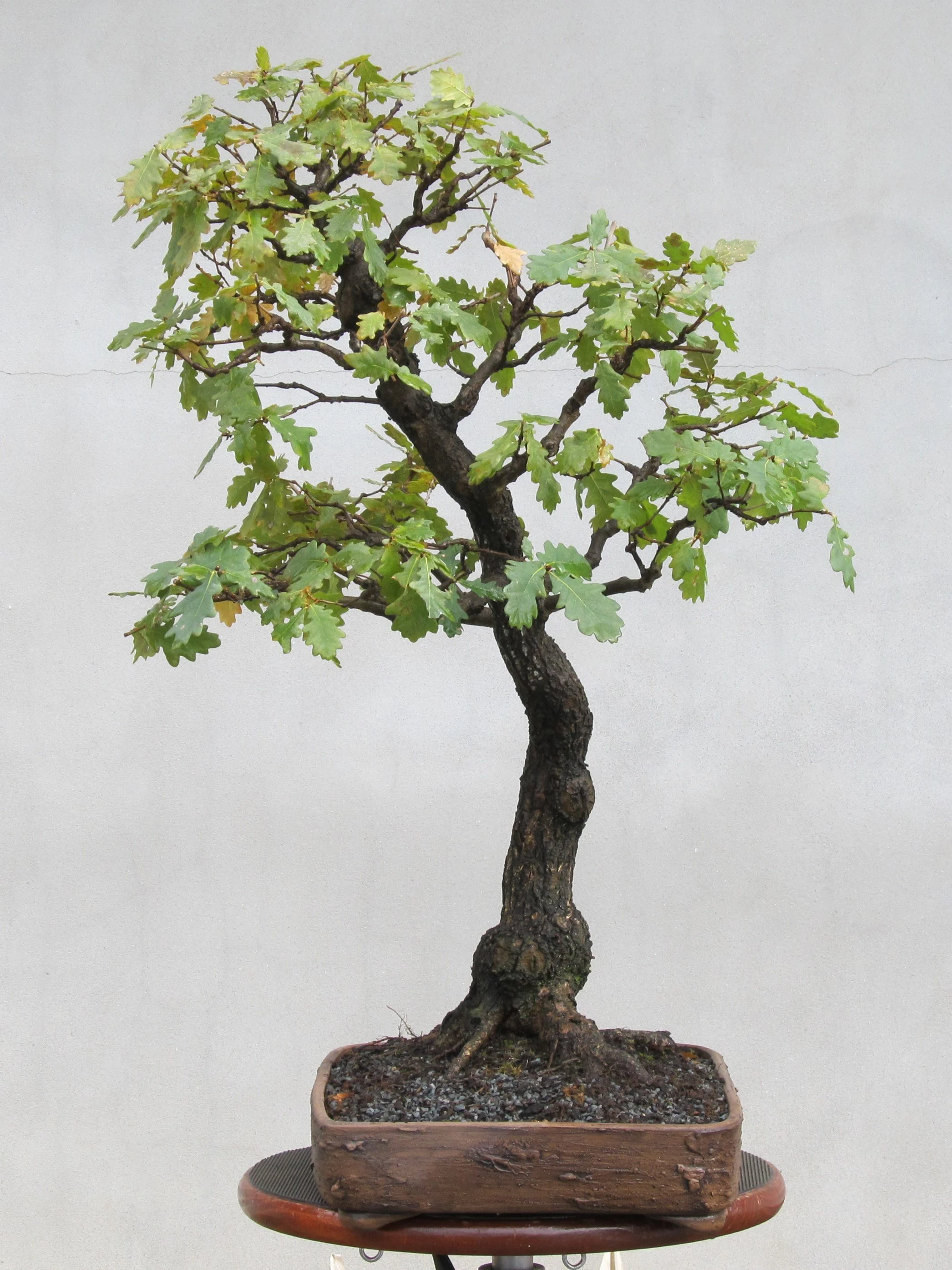 English oak leaves look very much like those of our native white oak (Quercus alba), only they are naturally smaller in size. That was an attraction. White oak is one of the great trees in this part of the world, and happens to be the most common tree species on the Arboretum property. I have tried numerous times over the years to make a white oak bonsai, but never with success. Like many of our native oaks, Quercus alba does not take well to bonsai culture. Quercus robur, on the other hand, had already proven amenable to container culture, and that, taken together with its smaller leaf size, suggested it might work as a bonsai subject. I figured it wouldn’t hurt to give it a try.