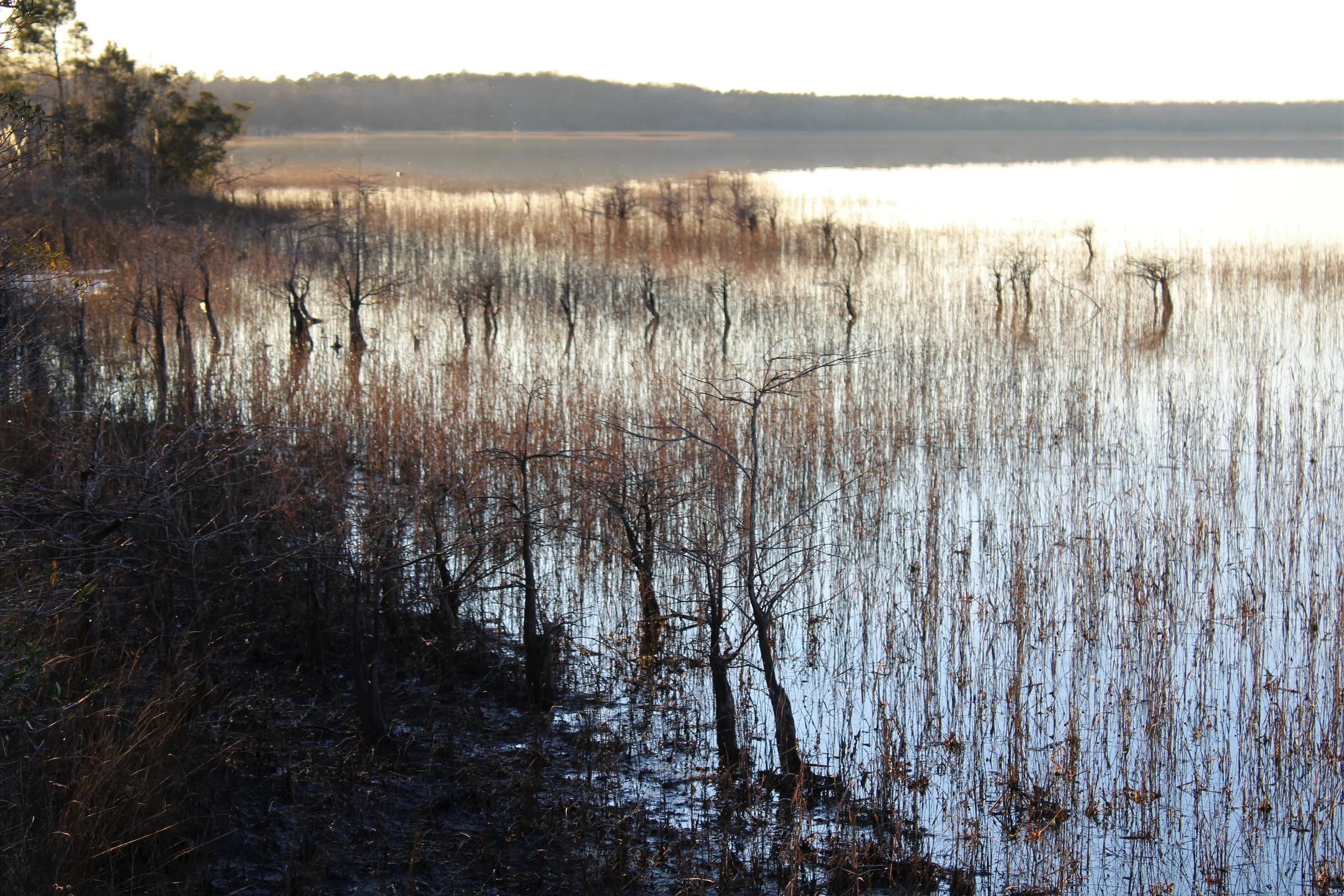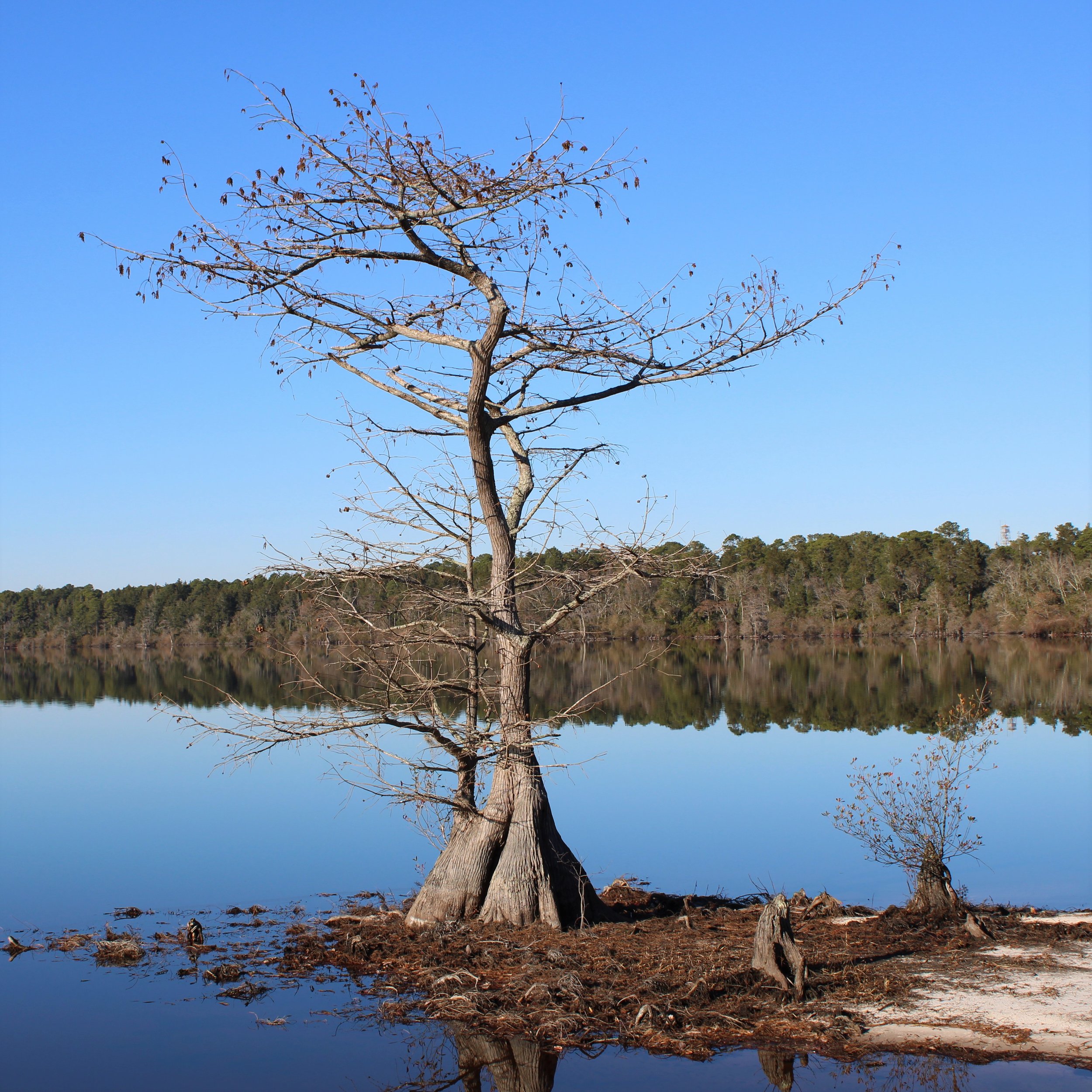 Jones Lake State Park features two bodies of water - Jones Lake and nearby Salters Lake - that are known as Carolina Bays. These formations are something of a mystery, but they are shallow and placid, the water stained dark like tea from tannin. Pondcypress (Taxodium ascendens) are found around the periphery of the lakes, with longleaf pines (Pinus palustrus) the dominant tree species in the surrounding forest. A special feature of Jones Lake is swamp with large old Atlantic whitecedars (Chamaecyparis thyoides) and loblolly bays (Gordonia lasianthus). None of these tree species are native to Western North Carolina.