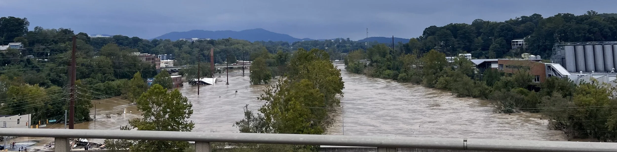 The French Broad River the day after the storm, seen from the Bowen Bridge, just west of downtown Asheville. A portion of the River Arts District can be seen underwater on the left.