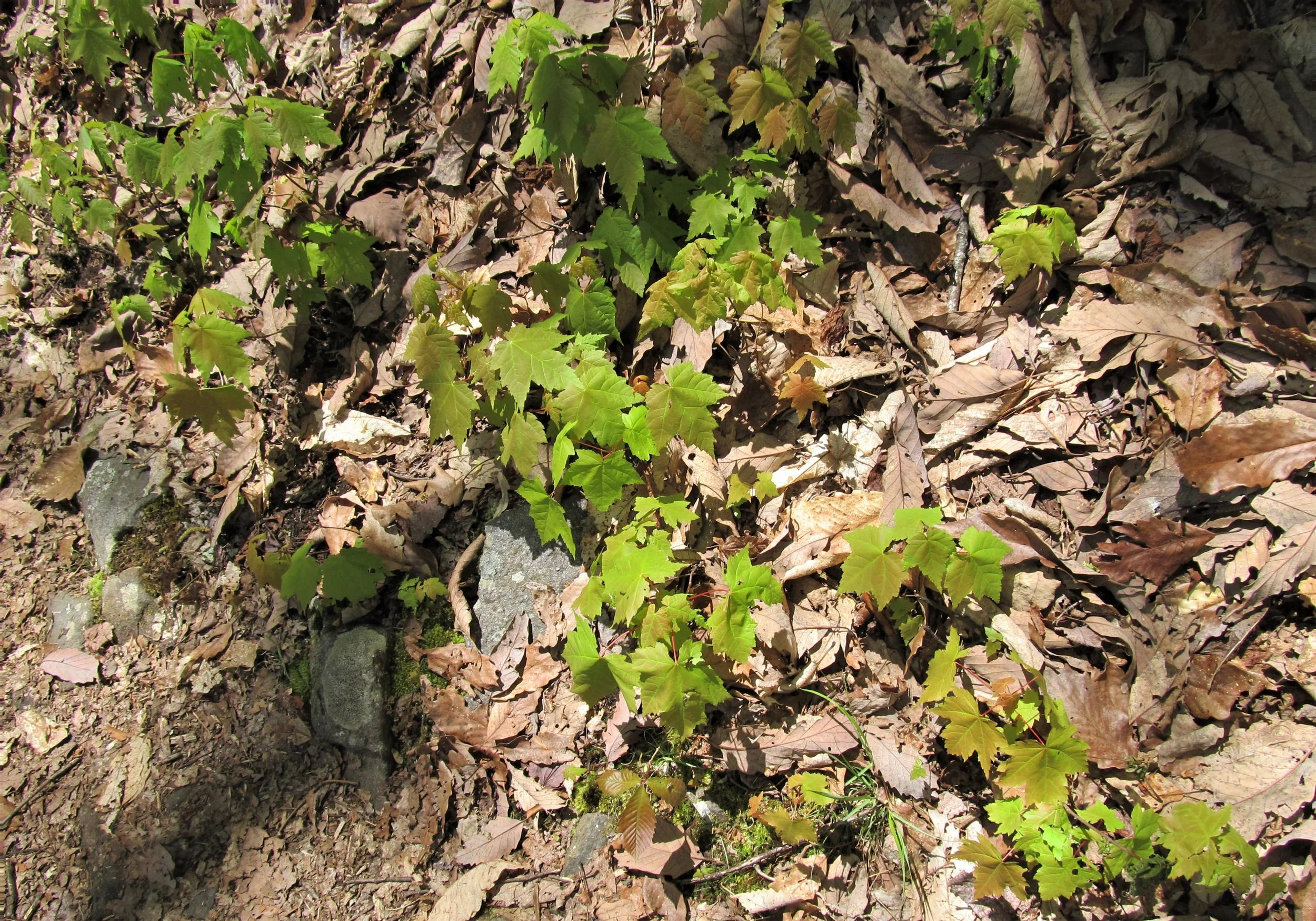 Red maple (Acer rubrum) seedlings growing on the forest floor, alongside a trail. Few, if any, of these will reach even the sapling stage.