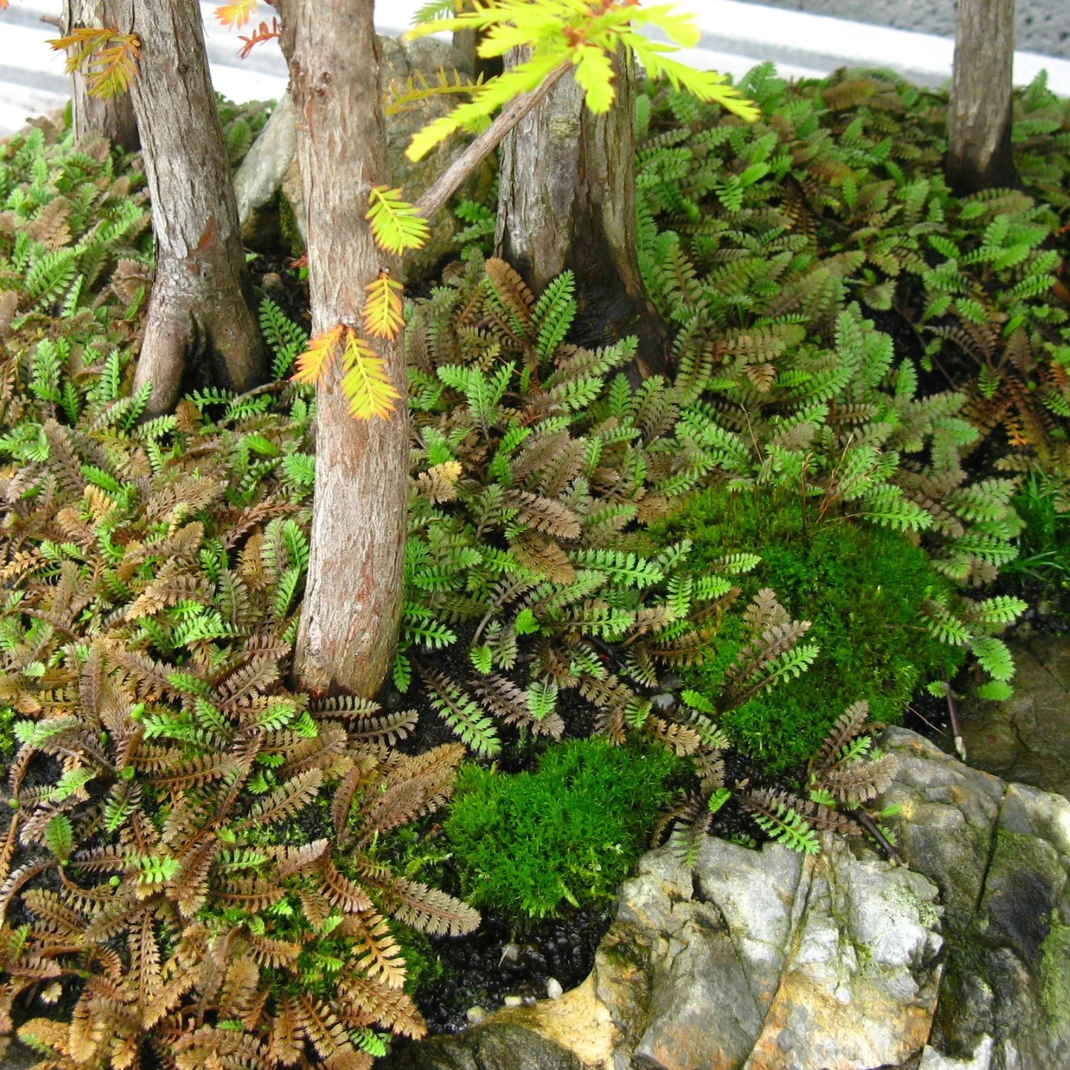 The baldcypress water-and-land planting Mr. Zhao made for us in his 1998 demonstration program was remarkably good right from the time he put it together. It had a great feeling to it, a kind of authenticity that evoked the experience of being in nature, somewhere in the hushed coniferous forest where the sound of water splashing on rock is so persistent it ceases to be noticeable. It took almost no effort to go there — to look at the landscape Mr. Zhao made and travel in your mind to that place in the imaginary forest. The trees were young, that was the only thing holding the planting back. The trees were young and their branching was mostly not there yet. The ground plane was excellent, though, with the old Chinese stones and an understory of mondo grass (Ophiopogon japonicus), and a little plant called brass buttons (Cotula coronopifolia) that did a good impersonation of a miniature fern. Mr. Zhao paid close attention to every detail.