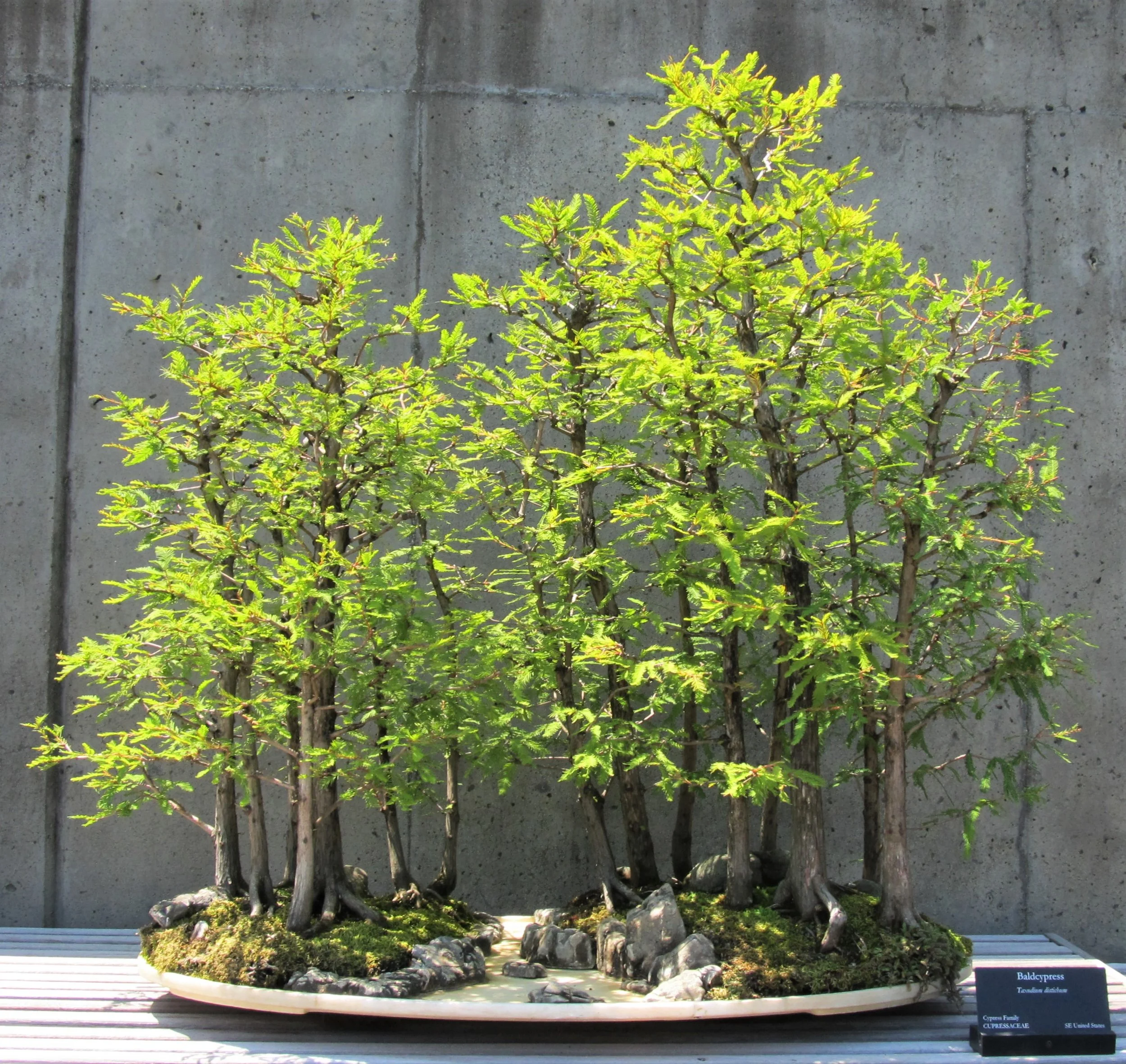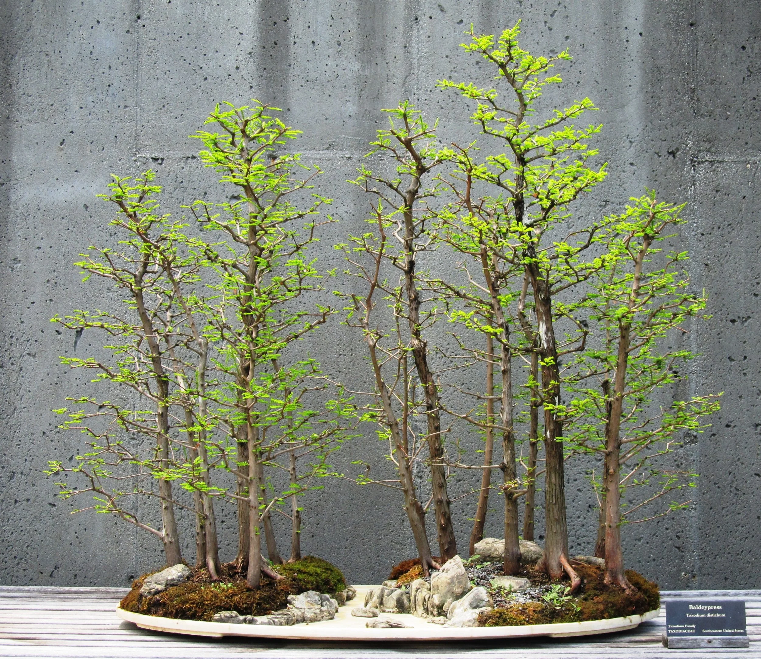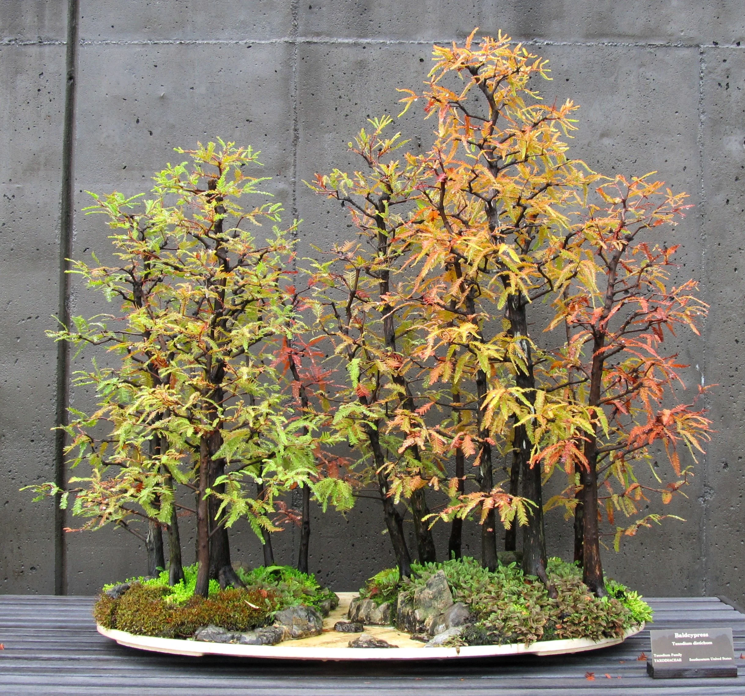 Plenty of viewers had the opportunity in the ensuing years. The baldcypress water-and-land planting was first publicly displayed at the opening of the Bonsai Exhibition Garden in October of 2005 and was a perennial favorite for fourteen straight years after that. Along the way all the baldcypress trees matured, becoming thicker and well-branched: