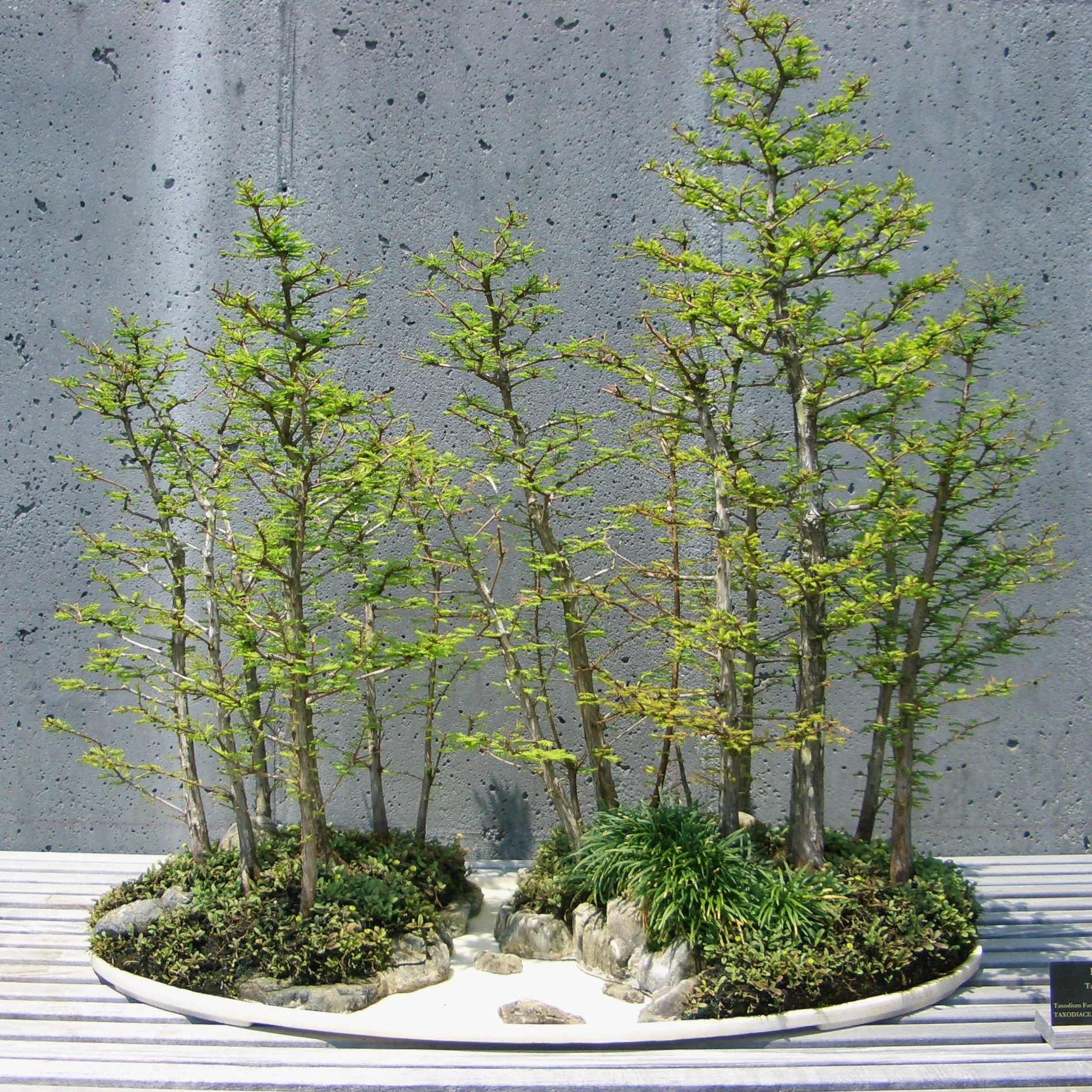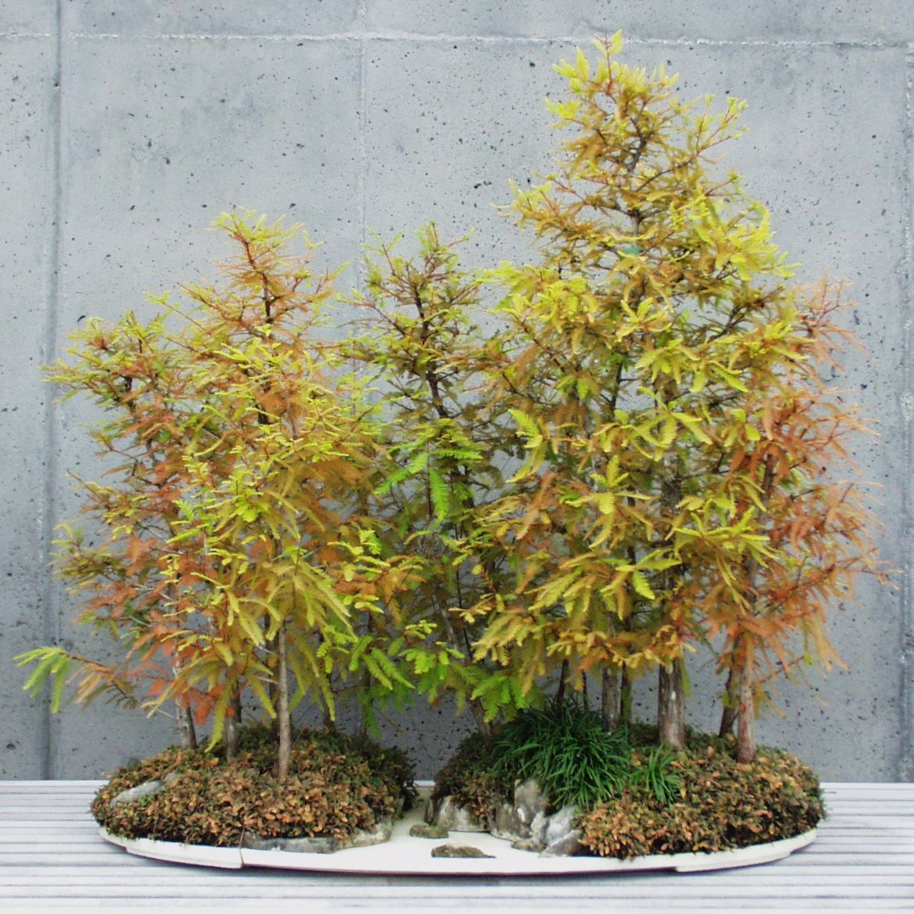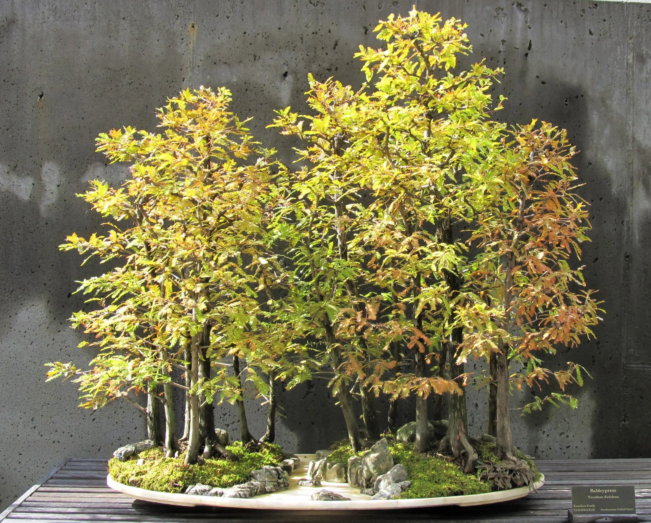 Plenty of viewers had the opportunity in the ensuing years. The baldcypress water-and-land planting was first publicly displayed at the opening of the Bonsai Exhibition Garden in October of 2005 and was a perennial favorite for fourteen straight years after that. Along the way all the baldcypress trees matured, becoming thicker and well-branched: